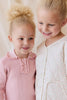The Cleo Top – Trinket is a beautifully knitted piece in a soft blush pink hue, featuring a delicate ribbed texture and a dainty ruffled collar. With its classic button placket and timeless silhouette, this top adds a touch of elegance to your little one’s wardrobe—perfect for layering or wearing on its own.