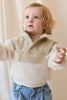 The Mackenzie Sherpa Top – Natural/Sandy Brown is a beautifully designed pullover that blends warmth with timeless style. Featuring a high collar with snap buttons and a sandy brown chest panel, this piece is both practical and charming. The body is made from ultra-soft white sherpa fleece, offering a plush feel your little one will love.