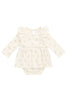 The Organic Cotton Vivienne Playsuit – Thelma Parchment is a beautifully soft and charming piece, designed for comfort and style. Featuring a delicate floral print on a light base, this long-sleeved playsuit includes ruffled shoulder details and a skirted silhouette — perfect for special occasions or everyday sweetness.